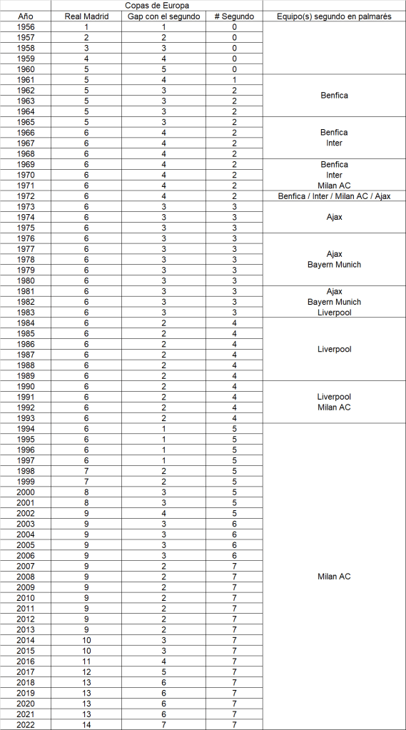 Es ahora, en 2022, cuando con 7 la distancia, medida en Copas de Europa, entre el Real Madrid y el segundo club con más títulos es más grande.