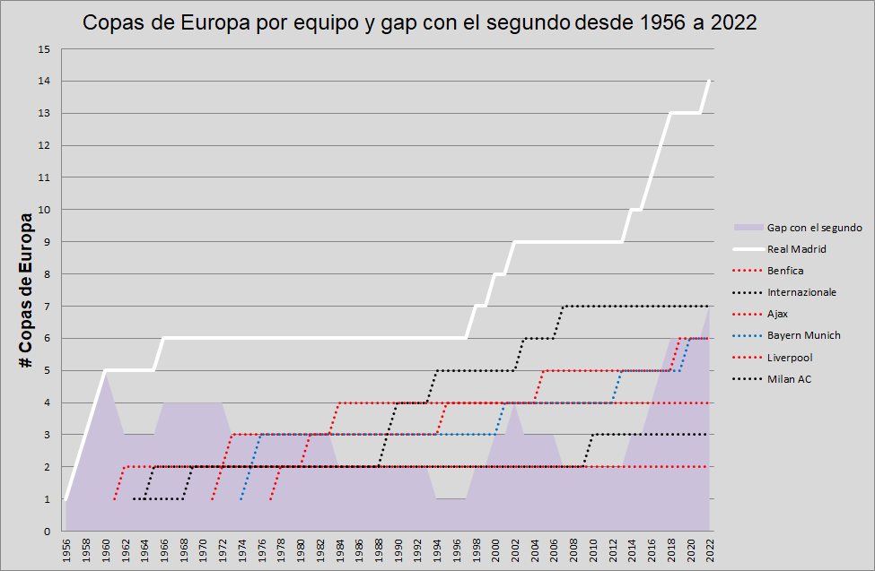 La gráfica presenta la evolución de las Copas de Europa conseguidas por el Real Madrid y todos aquellos clubes que en algún momento de la historia han sido el segundo equipo con más copas. Por orden: Benfica (Lisboa), Internazionale (Milan), Milan AC, Ajax Amsterdam, Bayern Munich, Liverpool y de nuevo Milan AC.