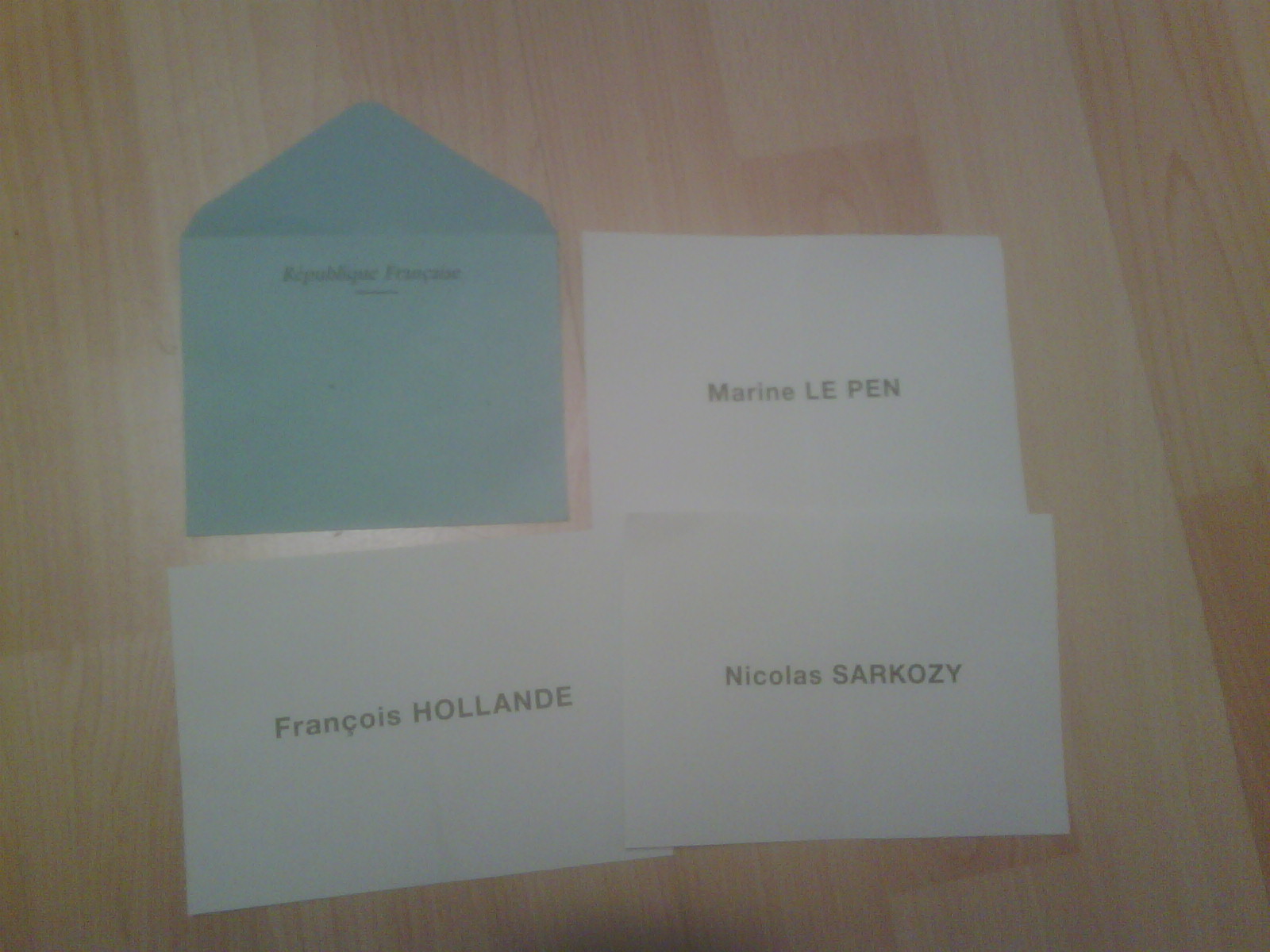 Well, it is very simple and very much like in Spain, even simpler. There were just 10 small stacks of ballots, one stack per candidate. The ballots are much simpler than in Spain. Just white papers with the name of the candidate. No name of the party, no fancy logo of the party. The envelope: simpler as well, just a small blue envelope reading “République Française”, nothing mentioning like “Presidential election 2012”, first or second round…