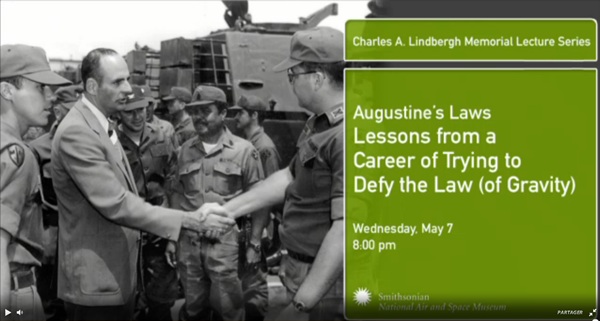 Some readers may believe I overstate it. Well, I invite you to watch the lecture he gave 2 days ago at the Smithsonian National Air and Space Museum (3) as part of the Charles A. Lindbergh Memorial Lecture Series. The lecture was titled “Lessons from a Career of Trying to Defy the Law (of Gravity)” [47’59”].