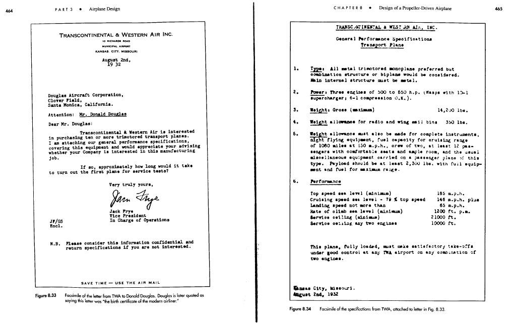 John D. Anderson, the curator of aerodynamics at the National Space and Air Museum (see this post about our visit to NASM at Dulles) was also a professor of Aerospace Engineering in the University of Maryland. Among other books, professor Anderson has written “Aircraft Performance and Design“ (McGraw-Hill, 1999) a terrific book on aircraft design. The chapter 8 of the book describes the process of the Design of a Propeller-Driven Airplane. It includes as a design case study, the Douglas DC-3, 20-pages to delight yourself about history, aeronautics and engineering. It starts with a copy of the letter from Jack Frye and the specifications from TWA: