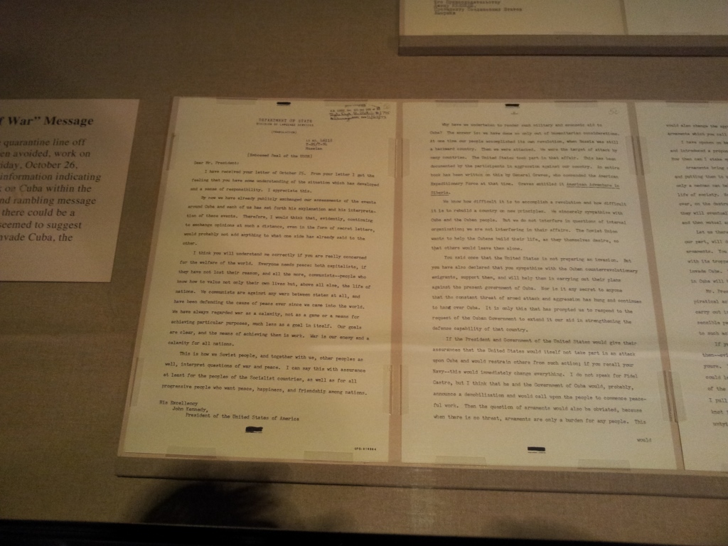 During our last visit to the USA, we visited Boston and made a very enlightening visit to the Presidential Library of John F. Kennedy. Among other things, I was very much attracted to the section on the Missile Crisis, and I took sometime reading the letters exchanged between Soviet Union’s premier Nikita Krushchev and US president Kennedy. They can be found in the “Office of the Historian” of the US Department of State.