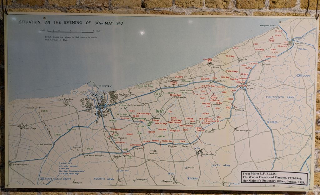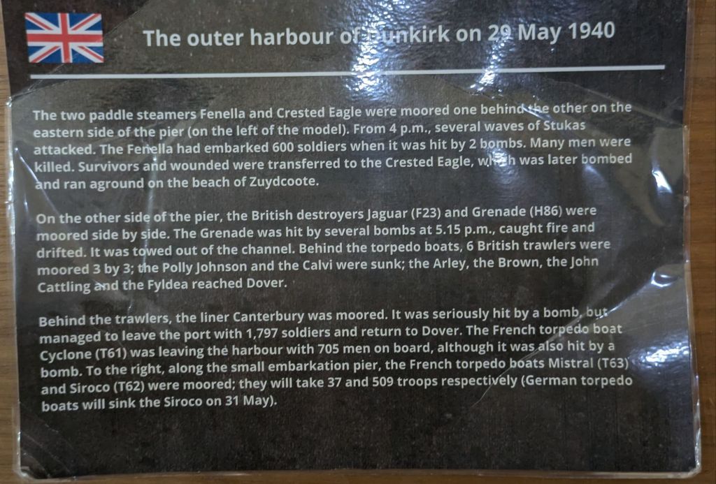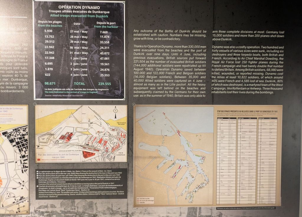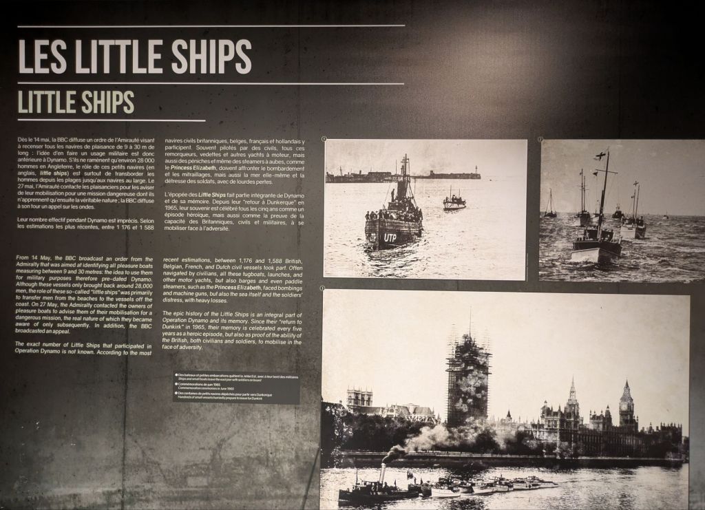 The big numbers shown in the panel at the museum: ~239k (71%) allied troops evacuated from the port and 98k (29%) from the beach; hence the lion’s share were evacuated from the port. Of the overall ~338k soldiers evacuated around ~28k (8%) were so thanks to the ~1,200 to 1,600 “little ships” involved, following orders from the Admiralty broadcast by the BBC (as seen on the movie). About 35 to 40k were taken as prisoners and there were around ~11k losses (87% evacuated, 10% prisoners, 3% losses).
