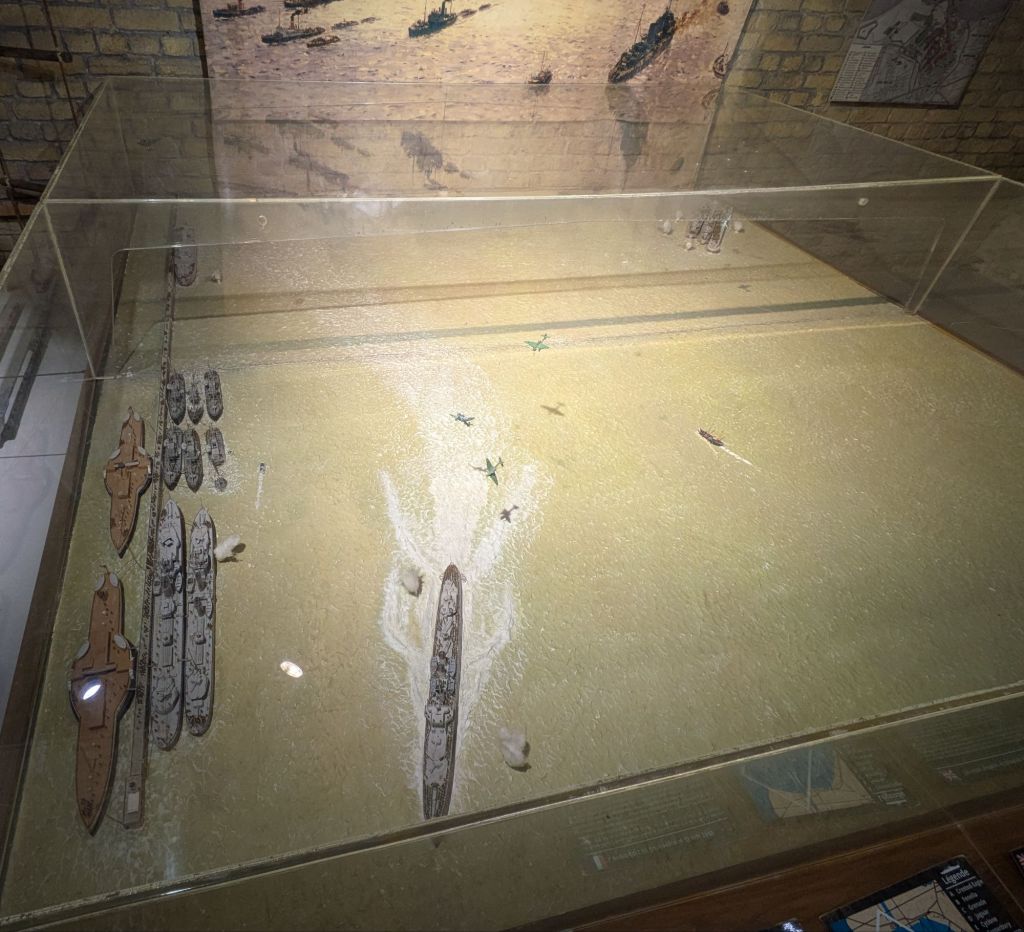In this mock up of the museum there is the situation of the different allied ships at both sides of the Malo pier, with the names in the legend and a description of the different bombs they received in those days.